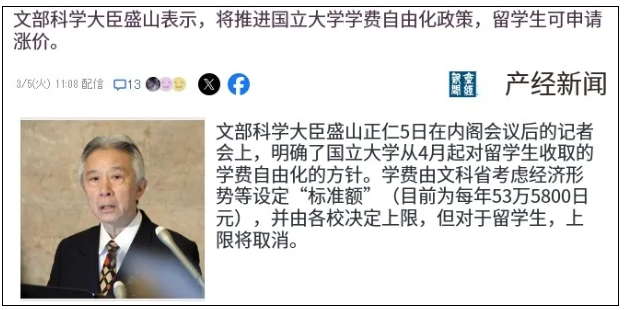 2024年3月,日本文部科學(xué)省發(fā)布關(guān)鍵政策:取消“外國留學(xué)生學(xué)費(fèi)與本土學(xué)生一致”的規(guī)定,允許國立大學(xué)自主設(shè)定留學(xué)生學(xué)費(fèi)(原標(biāo)準(zhǔn)學(xué)費(fèi)53.58萬日元)。