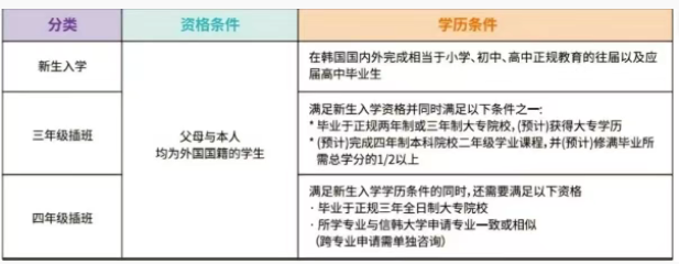 - 四年級插班:畢業于正規三年全日制大專院校 ;所學專業與信韓大學申請專業一致或相似